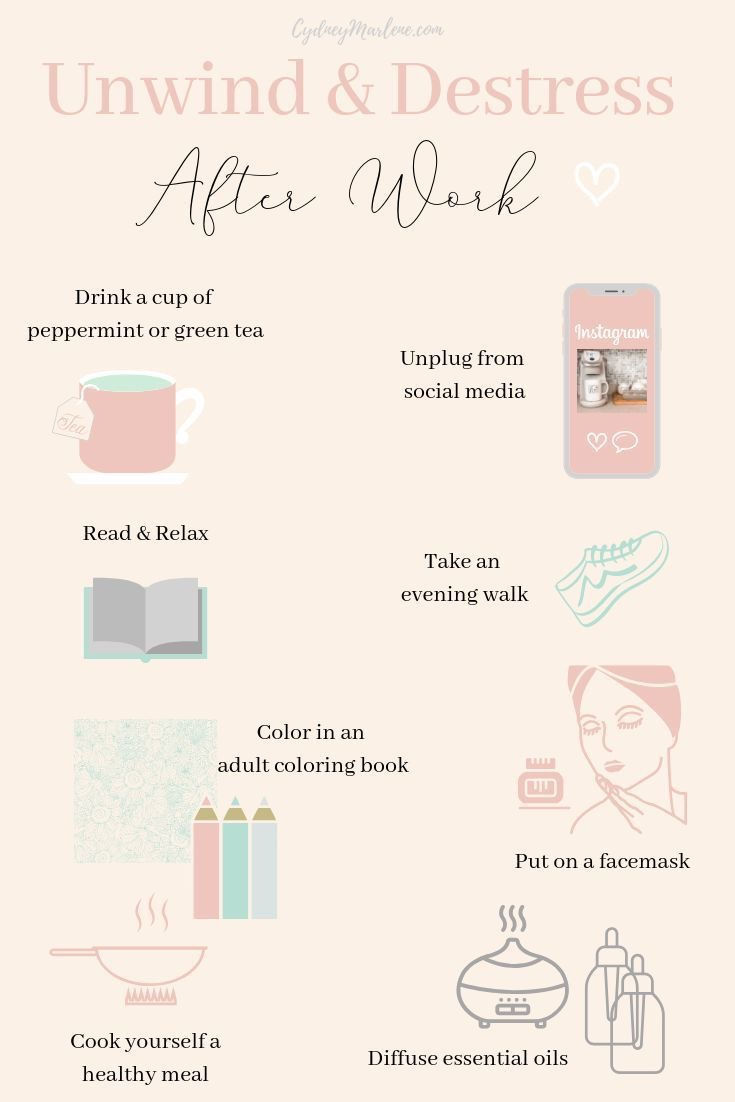 Tips to unwind. Set your smart goals, add your self care time and stay positive.